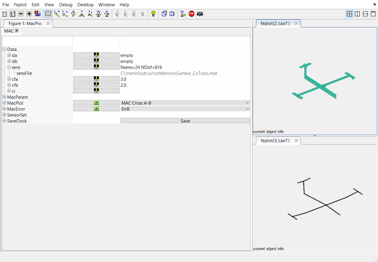 associated to the line sens to open the file containing the result of the superposition between a test wireframe and a FEM. This will open the import model window. Select the file to load : for this tutorial, the file is located at SDTPath/sdtdemos/gart_CoTopo.mat (it corresponds to the dock CoTopo saved file of the tutorial in section 3.1.1). Data is loaded and displayed in the two feplot figures. A brief description of the number of the observation is given in the table providing the number of sensors Nsens and the number of FEM DOFs NDof for the observation matrix.