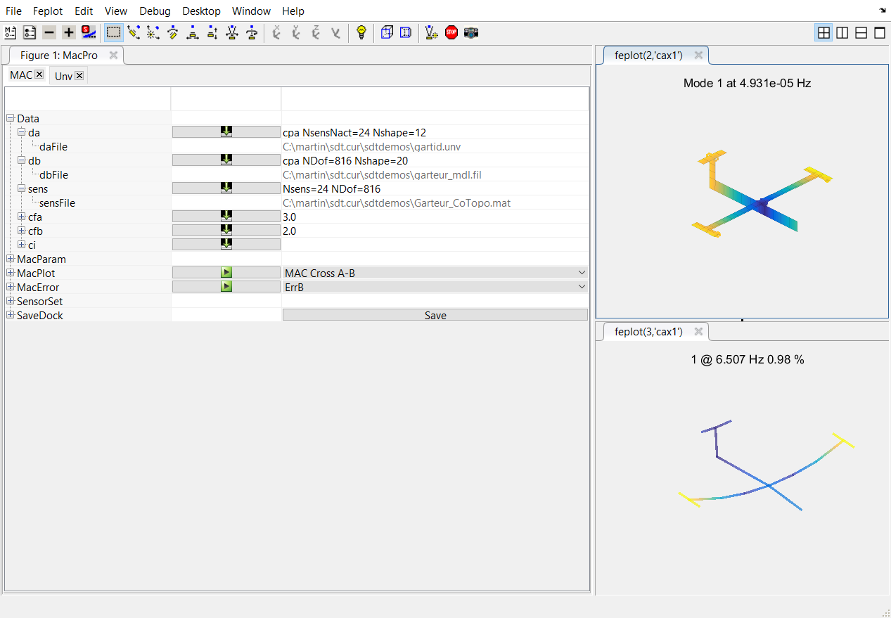 You can click on the square in the MAC matrix to interactively select the corresponding mode shapes in the feplot figure.