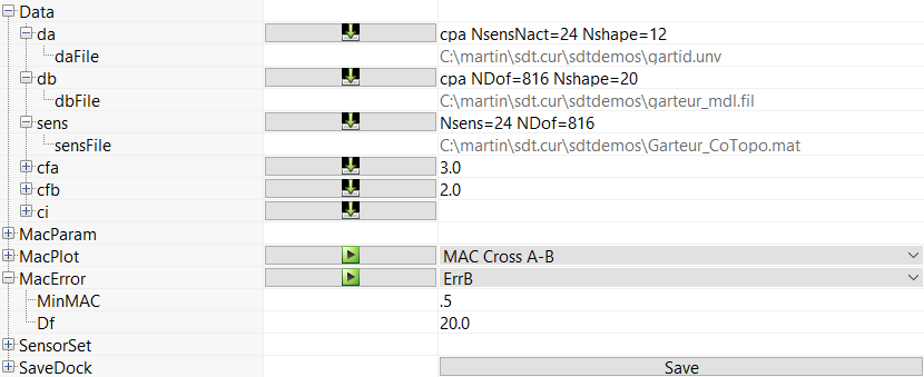 associated to the line da to load the identified modes. In the opening window, select the file SDTPath/sdtdemos/gartid.unv. This will open the Unv tab in which you need to select the line containing the shape data and click on import.Do the same with the line db to load numerical modes. Select the file SDTPath/sdtdemos/gart_mdl.fil (mode computation result from abaqus).