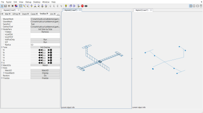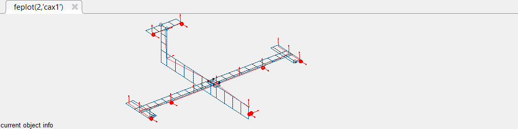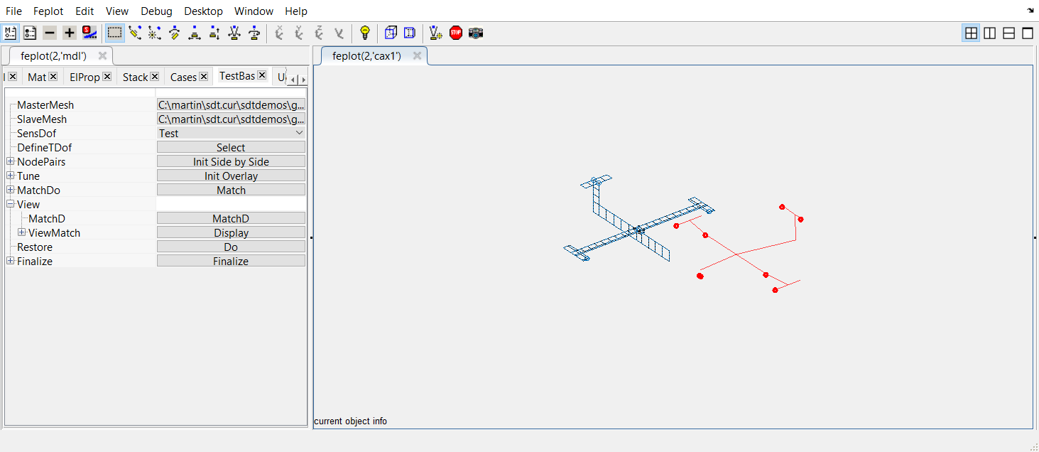 [model,TEST]=demosdt('DemoGartDataCoTopo'); % load FEM and TEST wireframe % Store Test as SensDof (linked test wireframe) in the FEM model=fe_case(model,'sensdof','sensors',TEST); cf=feplot(2); cf.mdl=model; % Display the model in feplot % Display the superposition of the test wireframe over the FEM fecom(cf,'ShowFiCoTopo'); % Open the CoTopo Dock from cf, already containing needed data fecom(cf,'dockCoTopo');