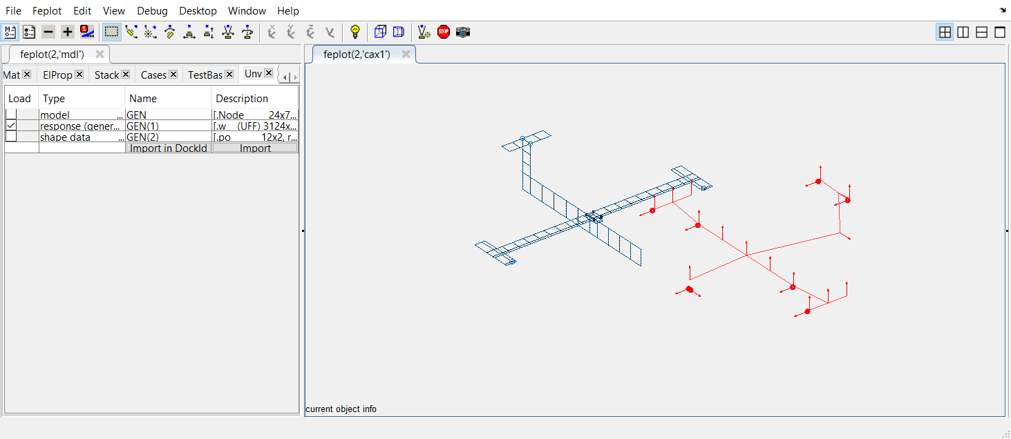 Do the same for the SlaveMesh. The test mesh file is located at SDTPath/sdtdemos/gartid.unv. Data is loaded and displayed in the feplot figure. Once selected, the Unv tab is displayed in the feplot('mdl') figure : it shows the content of what is inside the Unv file.Check the box corresponding to model and click on Import.