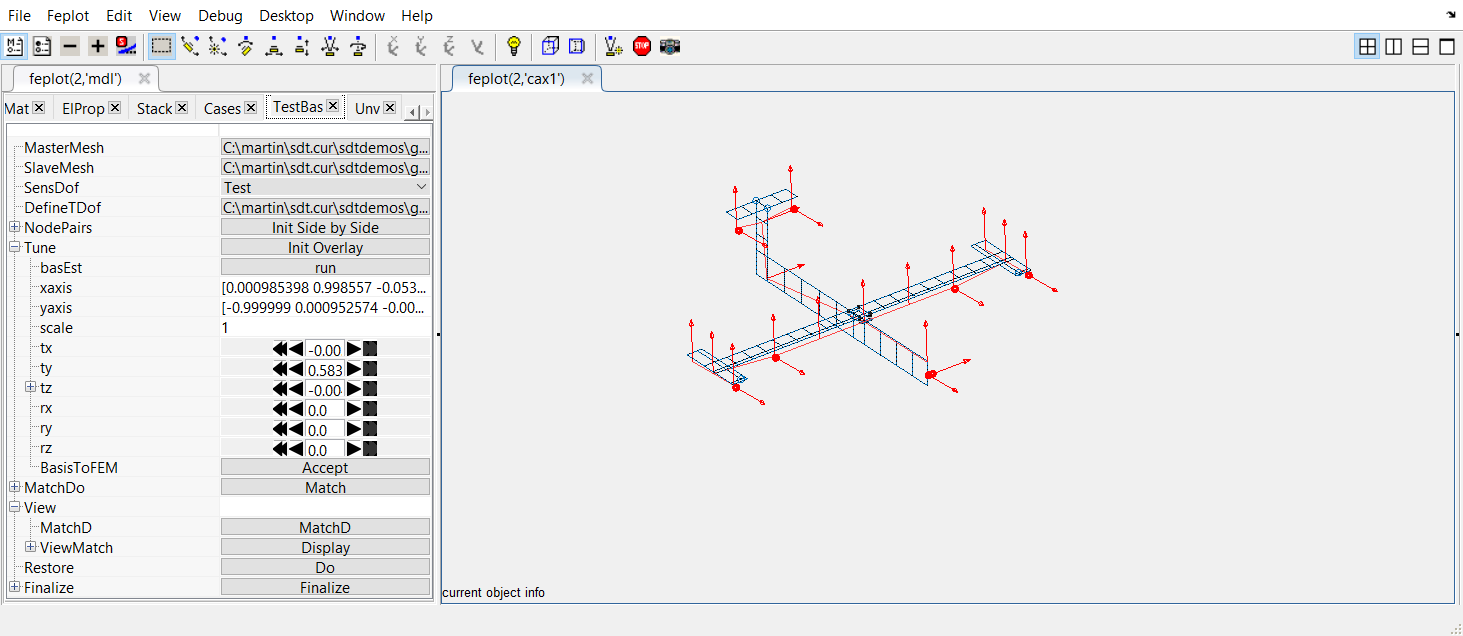 % Loading the interactive test mesh placement GUI cf=demosdt('demo garttebasis closeall'); % Load the demo data cf.CStack{'sensors'} % contains a SensDof entry with sensors and wireframe fecom(cf,'setTestBas'); % Open interactive tab in feplot properties