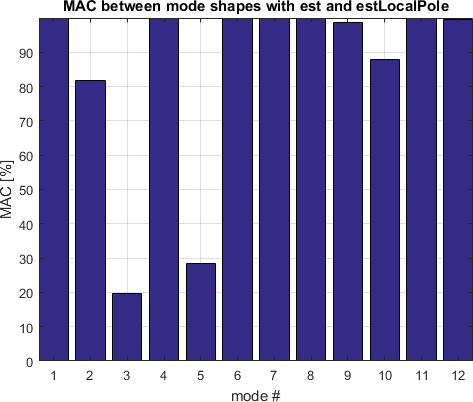 Each local identification is clearly closer to the measurements than using the broadband strategy. It should be noted that residues correspond to mode shapes and that consequences on proper identification of shapes can be important. The figure below shows the MAC between the set of mode shapes obtained with the FullBand versus the LocalPole algorithms.