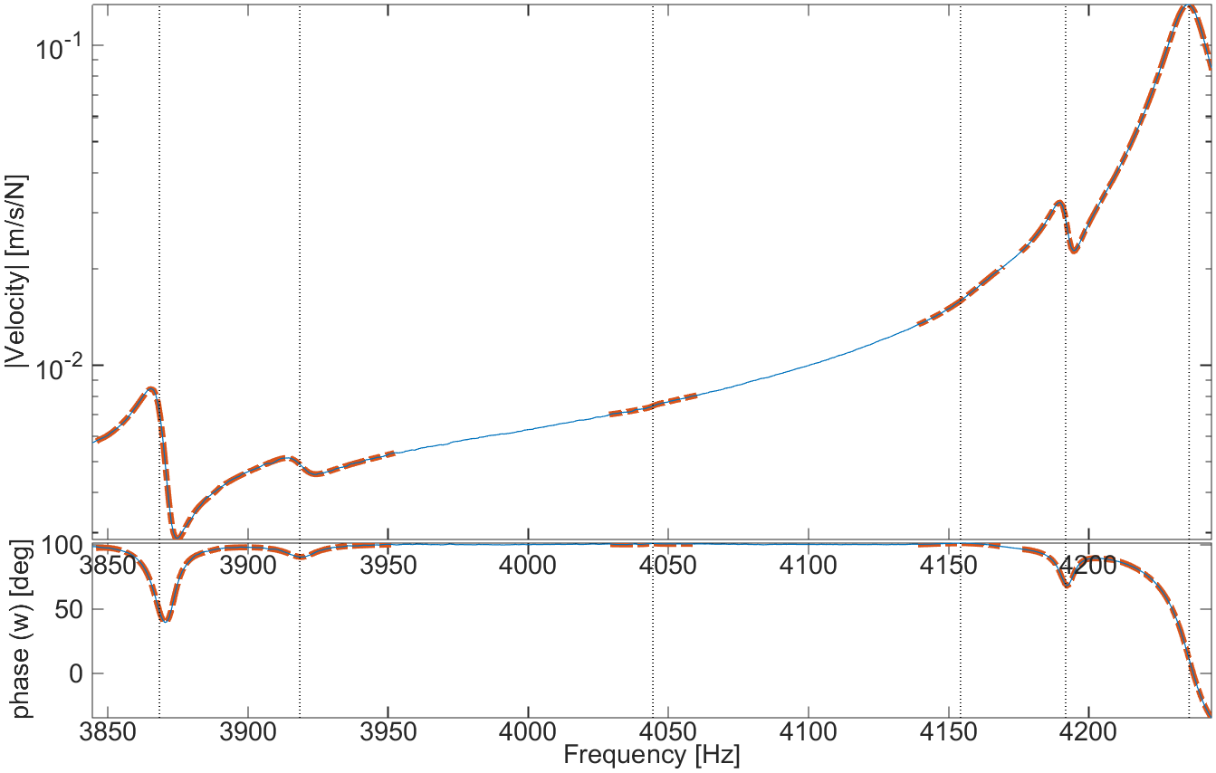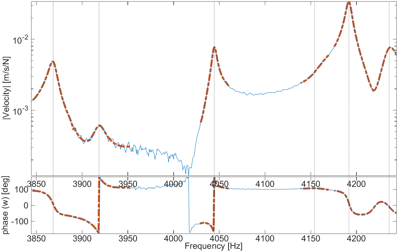 The fact that appropriate residual terms are needed to obtain good results can have significant effects. The figure above shows a typical problem where the identification is performed in the band indicated by the two vertical solid lines. When using the 7 poles of the band, two modes above the selected band have a strong contribution so that the fit (- - -) is poor and shows peaks that are more apparent than needed (in the 900-1100 Hz range the FRF should look flat). When the two modes just above the band are introduced, the fit becomes almost perfect (- — -) (only visible near 750 Hz).