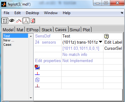 model=demosdt('demo ubeam-pro'); cf=feplot; model=cf.mdl; n8=feutil('getnode NodeId 8',model); % triax pos. tdof={'lab','SensType','SensId','X','Y','Z','DirSpec';... 'sensor1 - trans','',1,0.0,0.5,2.5,'Z'; 'sensor2 - triax','',2,n8(:,5),n8(:,6),n8(:,7),'X'; 'sensor2 - triax','',3,n8(:,5),n8(:,6),n8(:,7),'Y'; 'sensor2 - triax','',4,n8(:,5),n8(:,6),n8(:,7),'Z'}; sens=fe_sens('tdoftable',tdof); cf.mdl=fe_case(cf.mdl,'SensDof','output',sens); cf.mdl=fe_case(cf.mdl,'SensMatch radius1'); fecom(cf,'curtab Cases','output'); % open sensor GUI