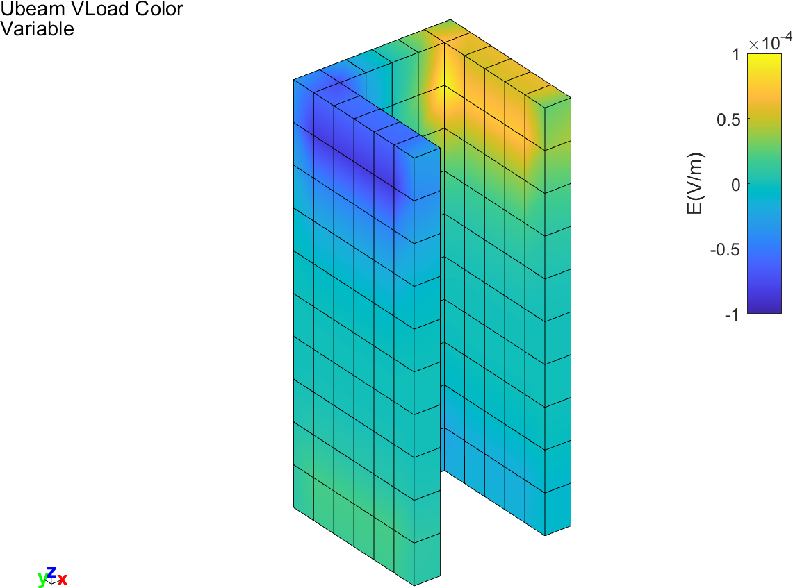 , the first load is defined by 'data' and is a constant volumic load in the y-direction. The second load, defined by 'data2' is in the z-direction and its magnitude depends both on the x and z position in the U-beam (f(x,z)=x*(z−1)3). The two loads are represented in Figures 4.12 and 4.13 using arrows and color codes (for the variable force only).