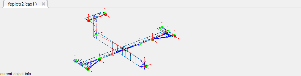 [model,TEST]=demosdt('DemoGartDataCoTopo'); % load FEM and TEST wireframe % Store Test as SensDof (linked test wireframe) in the FEM model=fe_case(model,'sensdof','sensors',TEST); cf=feplot(2); cf.mdl=model; % Display the model in feplot % Display the superposition of the test wireframe over the FEM fecom(cf,'ShowFiCoTopo'); % Open the CoTopo Dock from cf, already containing needed data fecom(cf,'dockCoTopo');
