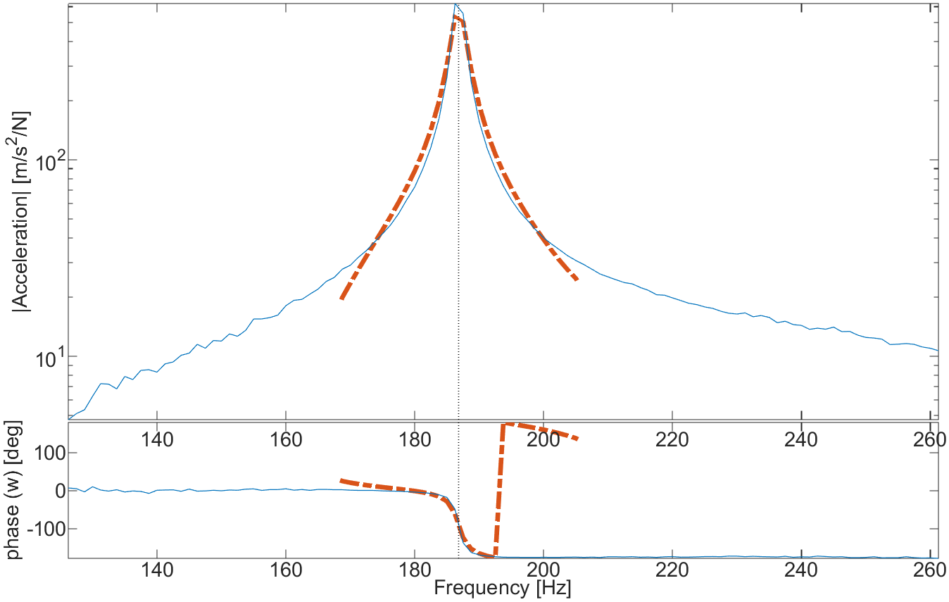 A perfect identification is obtained if measured and synthesized transfers are perfectly superposed. Because the contribution of a mode is characterized by the fact that its amplitude is maximum around the resonance frequency, a classical method to analyze the quality of the fit is to compare the measurement and the identification around each mode. We thus define the identification error for a mode j and input/output pair c by
