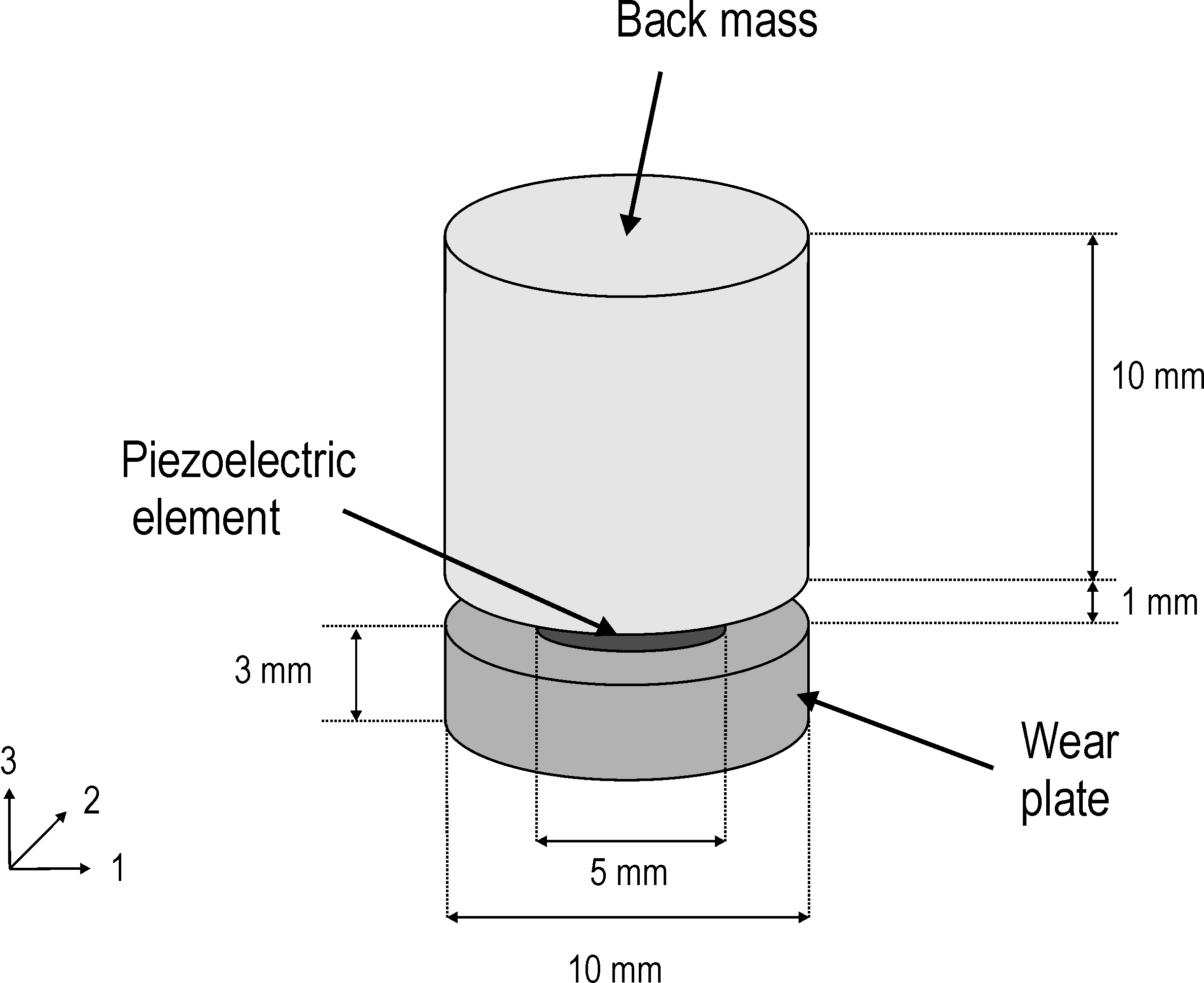 A basic design of a piezoelectric accelerometer working in the longitudinal mode is shown in Figure 8.3. In this example, the casing of the accelerometer is not taken into account, so that the device consists in a 3mm thick rigid wear plate (10mm diameter), a 1mm thick piezoelectric element (5mm diameter), and a 10mm thick (10mm diameter) steel proof mass. The mechanical properties of the three elements are given in Table 8.1. The piezoelectric properties of the sensing element are given in Table 8.2 and correspond to SONOX_P502_iso property in m_piezo Database. The sensing element is poled through the thickness and the two electrodes are on the top and bottom surfaces.